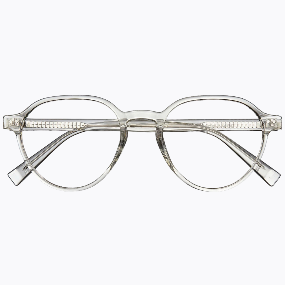 Translucent acetate, meticulously shaped into a sophisticated round frame, paired with polished silver metal temples for a seamless, lightweight design. Finished with subtle gold-tinted lenses, blending timeless craftsmanship with a luminous glow.